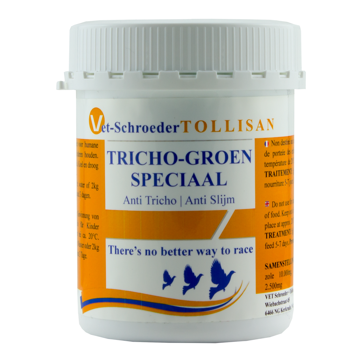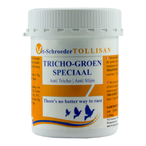 This new formulation is probably unique in the world right now. Special active ingredients and a particular galenic kill all trichomonads. Resistance problems, that frequently occur these days, are prevented after a treatment with this new mixture. A special active ingredient the digestive tracht in the Tricho Green powder allows the fasces to roll across the loft floor after only two days.