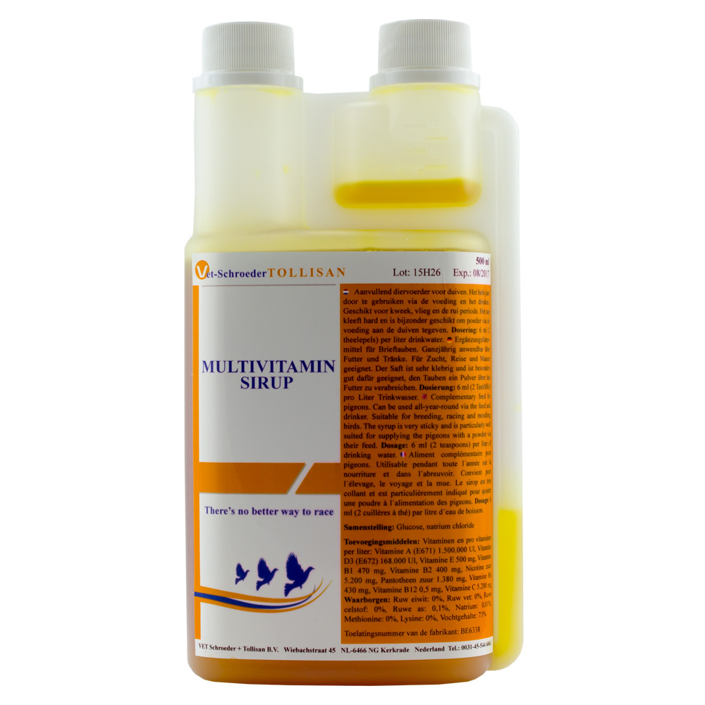 فيتامين أ (E671) 1.500.000 ، فيتامين D3 (E672) 168.000 Ul ، فيتامين E 500 مجم ، فيتامين B1 470 mg ، فيتامين B2 400 مجم ، حمض النيكوتينيك 5.200 mg ، حمض البانتوثنيك 1.380 mg ، فيتامين B6 430 mg ، فيتامين B12 0،5 ملغ ، فيتامين ج 5.200 ملغ